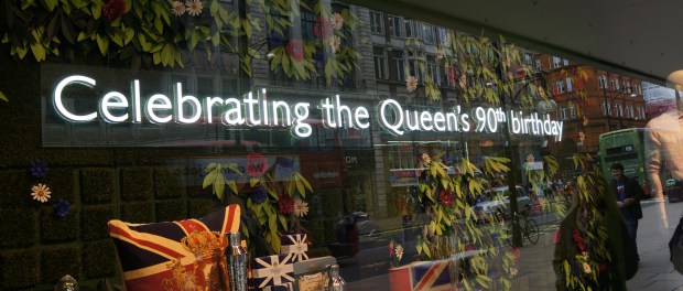 El West End, en el corazón de Londres, celebra los 90 años de la reina Isabel II con banderas británicas que ya ondean en las principales calles, mientras que algunos comercios ofrecen productos conmemorativos. Foto: Notimex.