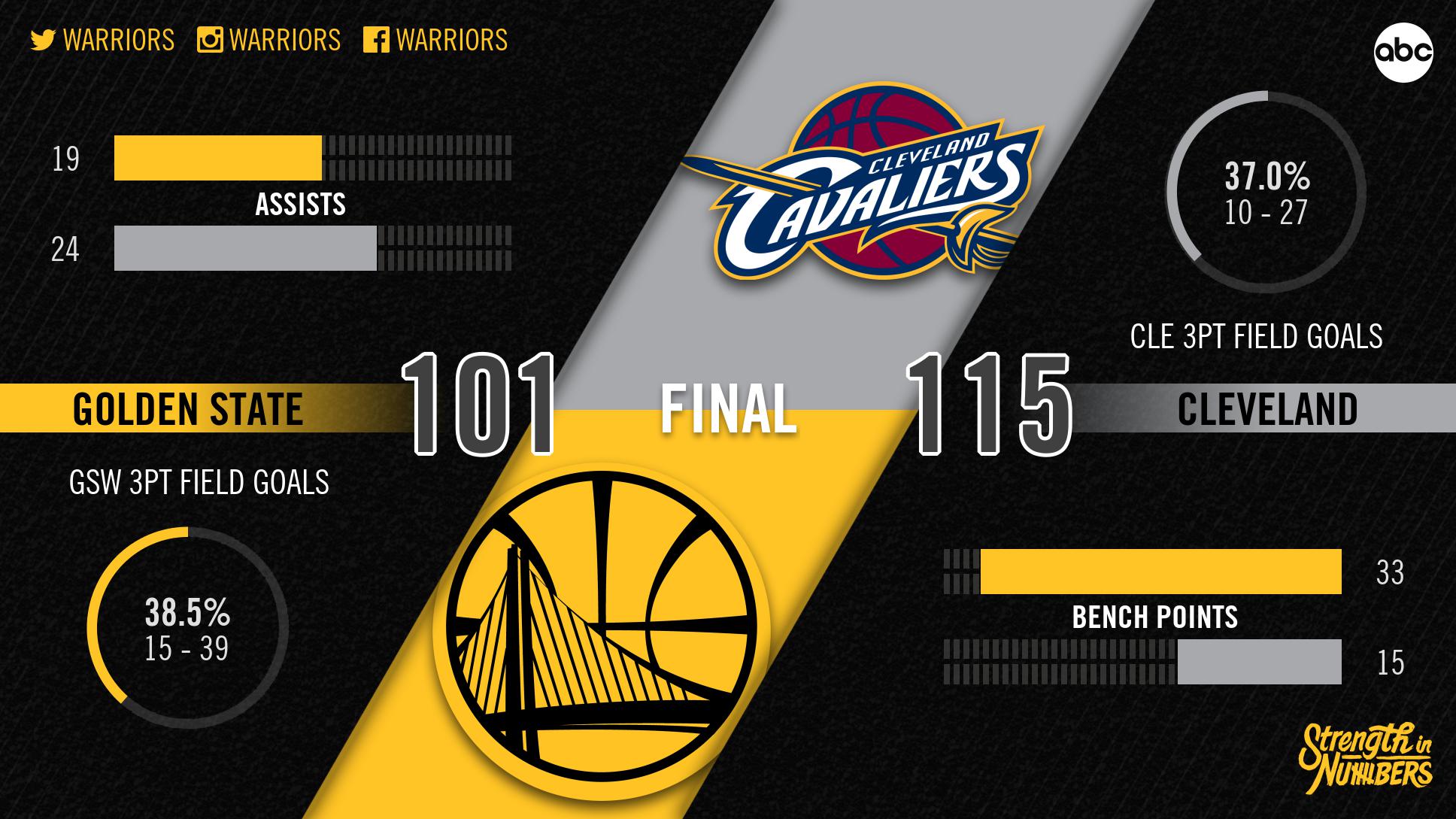 Los 20 puntos de diferencia fue la segunda mayor ventaja de un primer cuarto en las finales de la NBA, siendo la más grande un 35-14 de Lakers de Los Ángeles ante Celtic de Boston, en un cuarto partido en 2008, mientras que las 11 unidades de Warriors fue su peor producción en cualquier periodo durante toda la actual temporada.