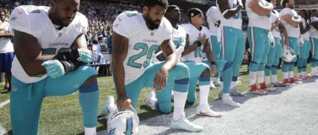 Este domingo, Arian Foster, Jelani Jenkins, Michael Thomas y Kenny Stills, de los Delfines de Miami, se hincaron durante el himno nacional; en tanto que Marcus Peters, de los Jefes de Kansas City, alzó uno de sus puños mientras se escuchaba en las bocinas la canción nacional estadunidense.