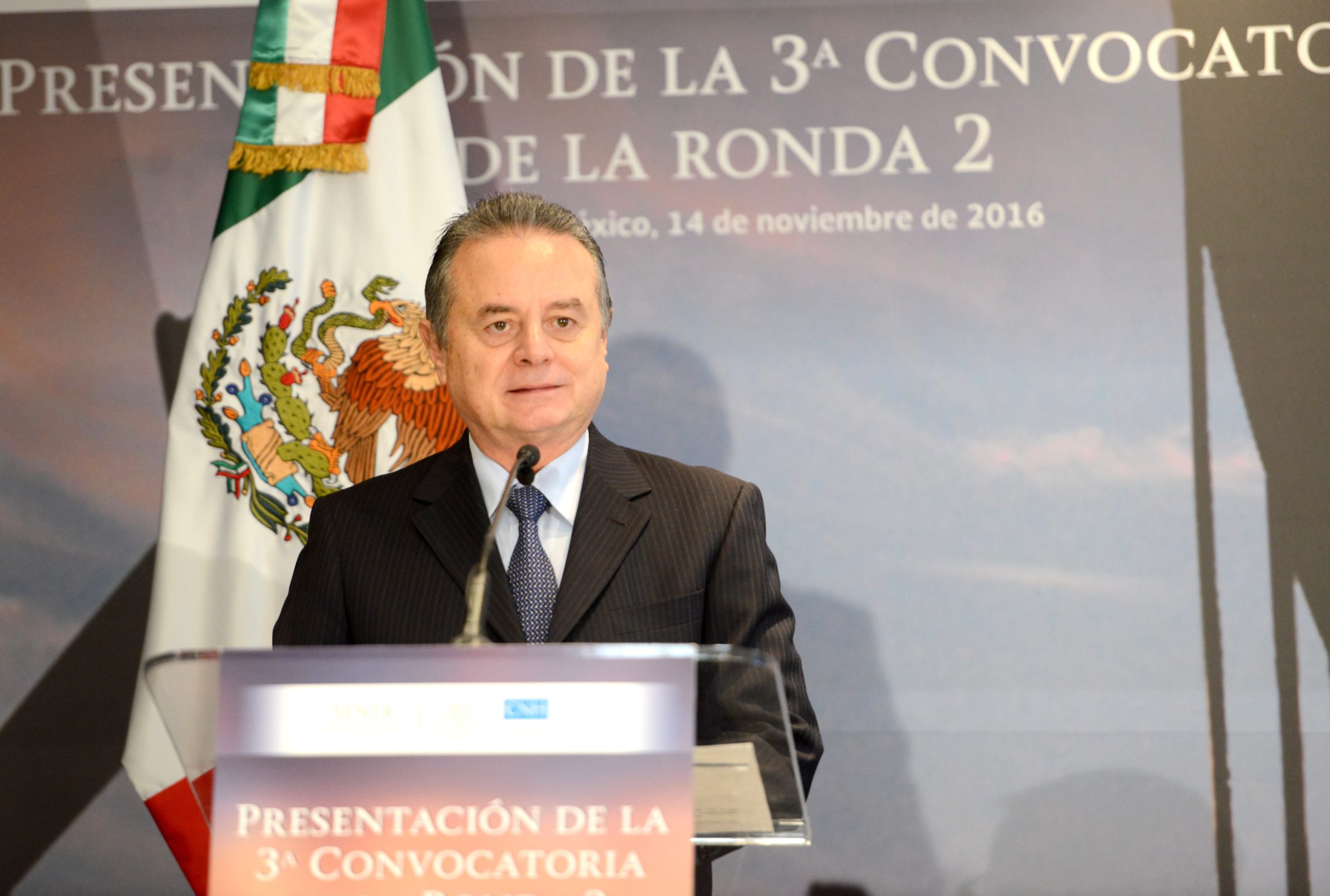 61114074. México, 14 Nov 2016 (Notimex- Especial).- El día de hoy el Secretario de Energía, Pedro Joaquín Coldwell, encabezó la presentación de la Tercera Licitación de la Ronda Dos, la cual comprende 14 áreas contractuales para la exploración y extracción en zonas terrestres y para la cual se estima una inversión de casi mil millones de dólares. NOTIMEX/FOTO/ESPECIAL/COR/ACE