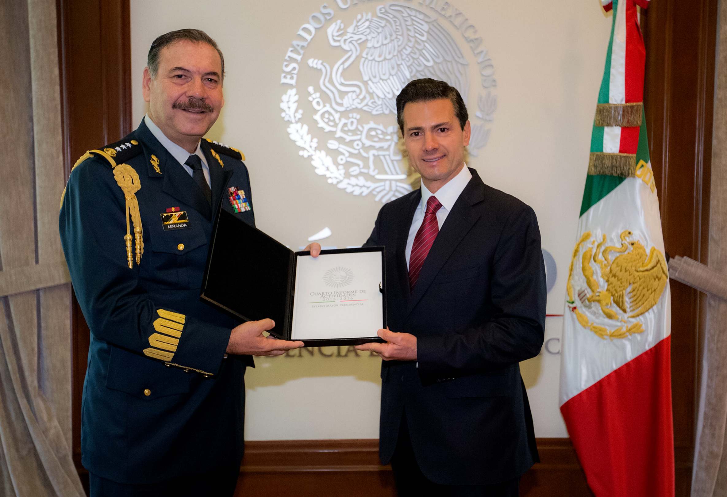 México.- El presidente Enrique Peña Nieto recibió este martes en la residencia oficial de Los Pinos el Cuarto Informe de Actividades del jefe del Estado Mayor Presidencial (EMP), Roberto Miranda Moreno.