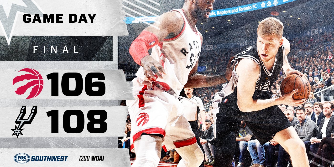 San Antonio logró la victoria 36, por nueve derrotas, para seguir como segundo lugar en la clasificación de la Conferencia Oeste de la Asociación Nacional de Baloncesto (NBA), mientras Toronto también es segundo, en la Este, ahora con 28-17.