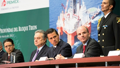 México.- El presidente Enrique Peña Nieto atestiguó la firma del primer contrato entre Petróleos Mexicanos (Pemex) y una empresa privada para la exploración y extracción de hidrocarburos en aguas profundas del Bloque Trion.