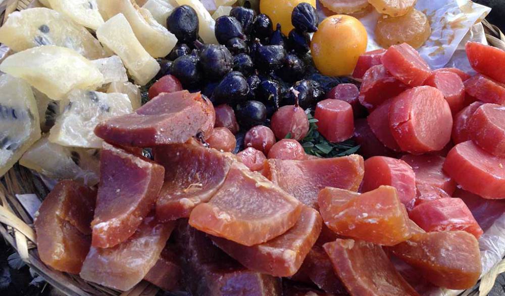 Higos, manzanas, papaya, chayote, nopal y jícama son algunos de los productos que conforman la amplia lista de dulces; aunque los que destacan por ser los más solicitados son el camote, el chilacayote y la calabaza.
