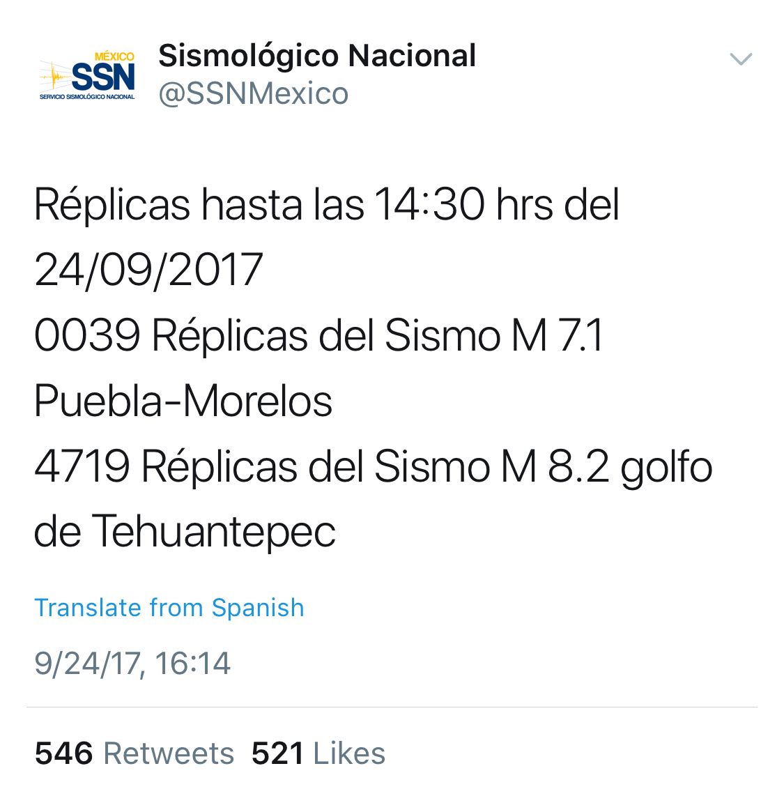 En su cuenta de Twitter @SSNMexico publicó “Réplicas hasta las 14:30 hrs del 24/09/2017 0039 Réplicas del Sismo M 7.1 Puebla-Morelos 4719 Réplicas del Sismo M 8.2 golfo de Tehuantepec”.
