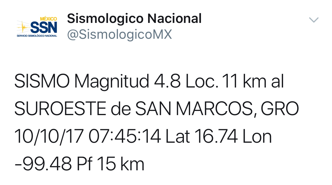 “SISMO Magnitud 4.8 Loc. 11 km al SUROESTE de SAN MARCOS, GRO 10/10/17 07:45:14 Lat 16.74 Lon -99.48 Pf 15 km”, escribió en su cuenta de Twitter @SismologicoMX.