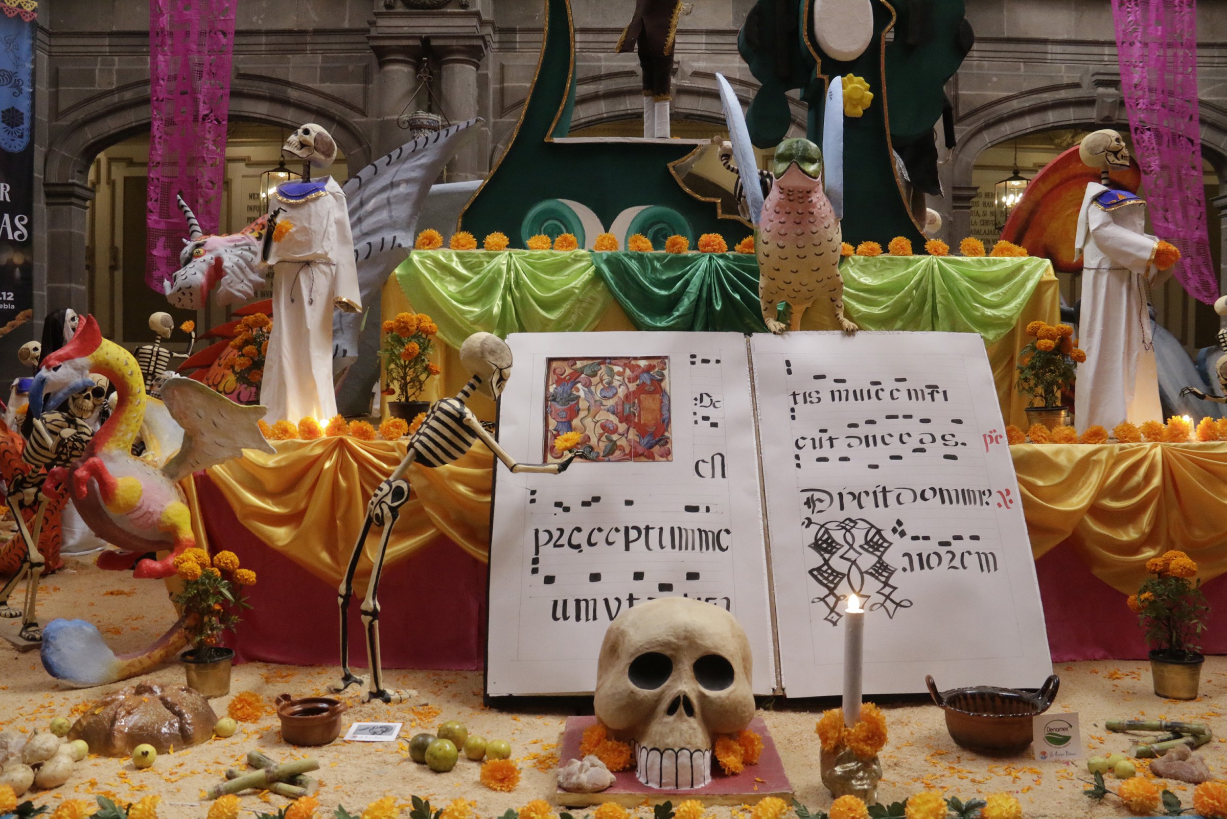 71030096. Puebla. 30 Oct. 2017 (Notimex- Carlos Pacheco).- Ofrenda dedicada a la familia Lagarto; pintores de los libros de coro de la Catedral, S. XVII, la cual se ubica en el Palacio Municipal de Puebla, como parte del “Corredor de ofrendas” por el Día de Muertos, que podrá ser visitado hasta el 12 de noviembre.