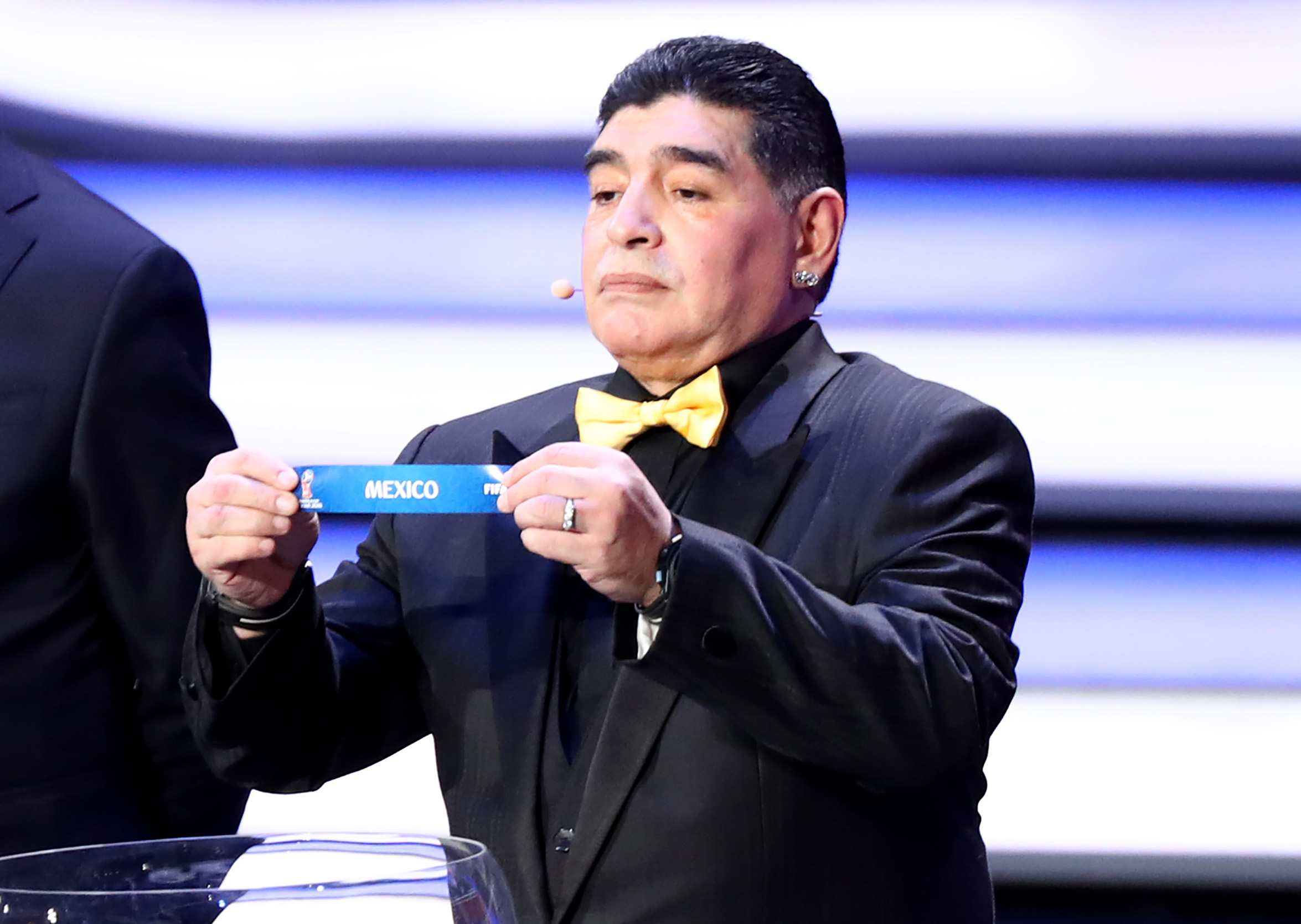 71201024. Moscú, 1 Dic 2017 (Notimex- DPA).- El futbolista retirado Diego Maradona sostiene el boleto para México durante el sorteo de la Copa Mundial FIFA 2018 en el Palacio Estatal del Kremlin en Moscú, Rusia. La Selección Nacional de México quedó ubicado en el Grupo F de la Copa del Mundo Rusia 2018, en el que hará su debut con el monarca defensor, el representativo de Alemania, partido a desarrollarse en Moscú. NOTIMEX/FOTO/ CHRISTIAN CHARISIUS/DPA/COR/SPO/
