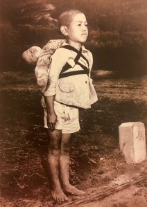 Es la imagen «que tomó el fotógrafo estadunidense Joseph Roger O’Donnell después del bombardeo atómico en Nagasaki. La tristeza del niño sólo se expresa en sus labios mordidos y rezumados de sangre”, agregó.