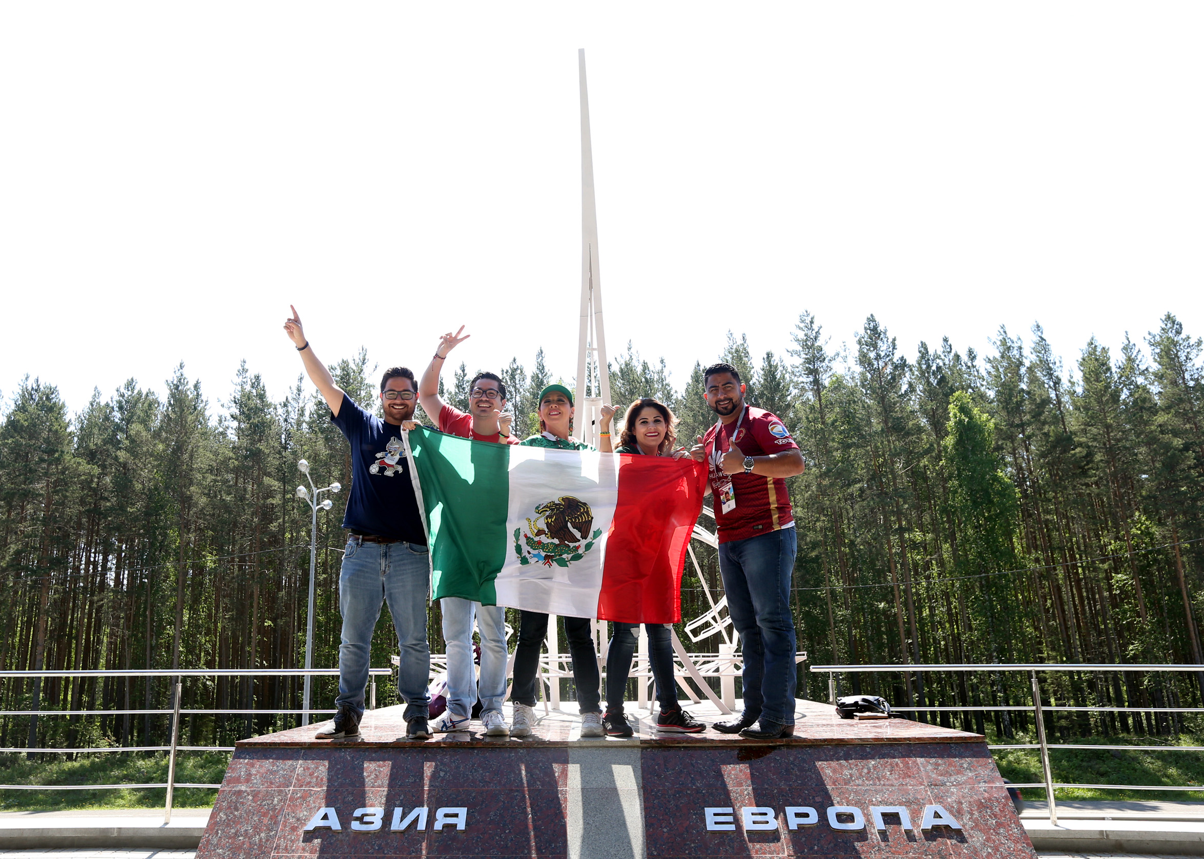 Un grupo de mexicanos visitan el monumento que marca el límite entre Europa y Asia, situado en los montes Urales a unos 40 kilómetros al oeste de Ekaterimburgo, en el marco del Mundial Rusia 2018. Foto: Notimex
