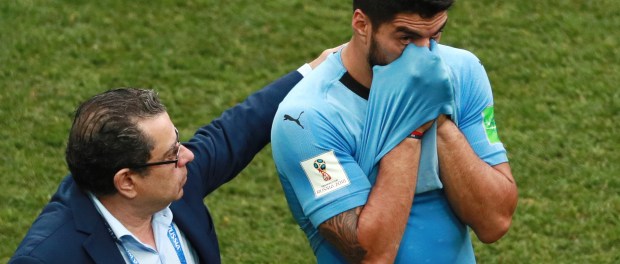 El jugador de Uruguay, Luis Suárez, llora tras la derrota 0-2 de su equipo en el partido de futbol de cuartos de final de la Copa del Mundo entre Uruguay y Francia en el estadio Nizhny Novgorod, en Rusia. Foto: Notimex