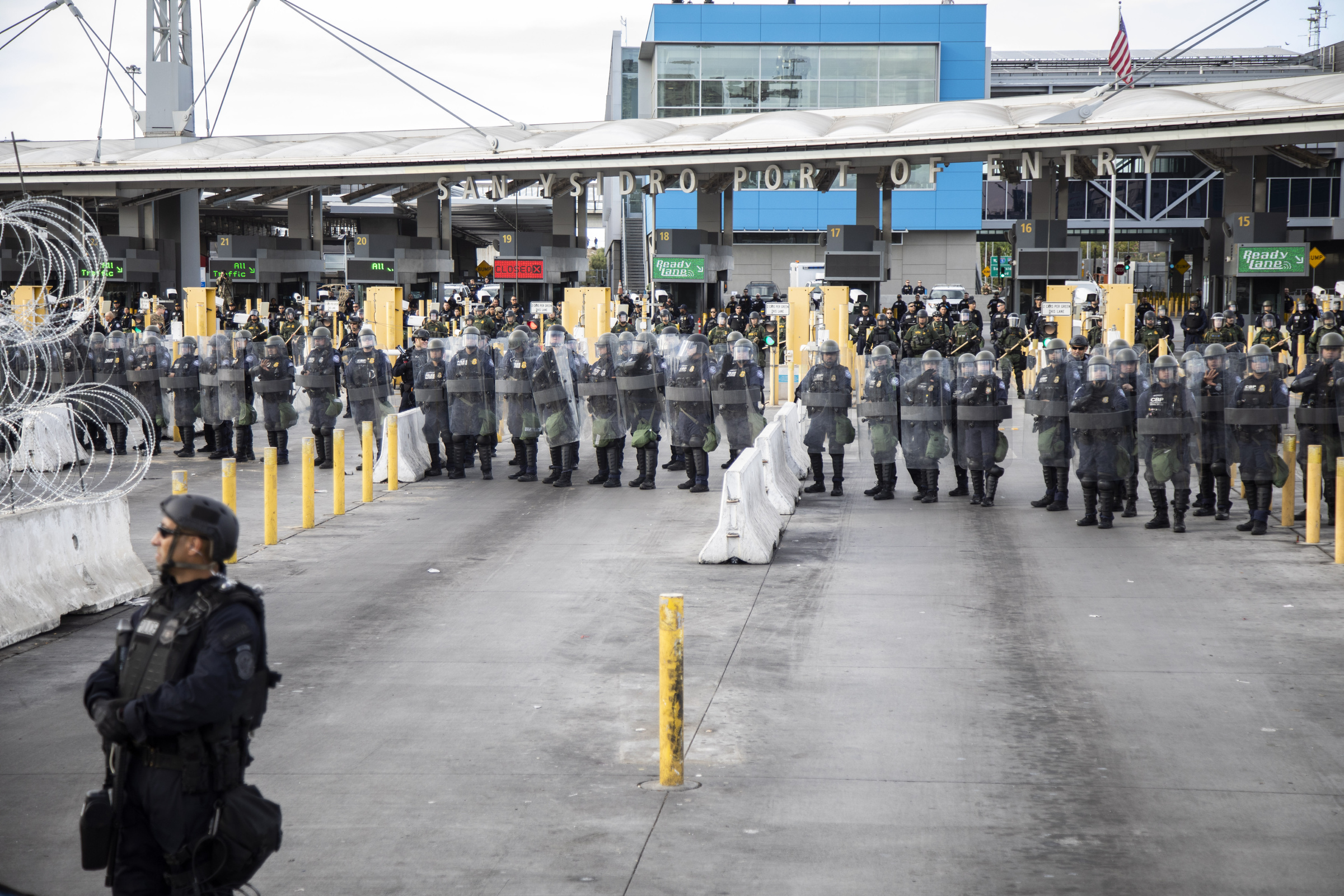 Elementos de la Oficina de Aduanas y Protección de Fronteras (CBP por sus siglas en inglés) y de la Policía Federal resguardan el puerto de entrada que desde hace días fue reforzado con muros de contención y alambre de púas.