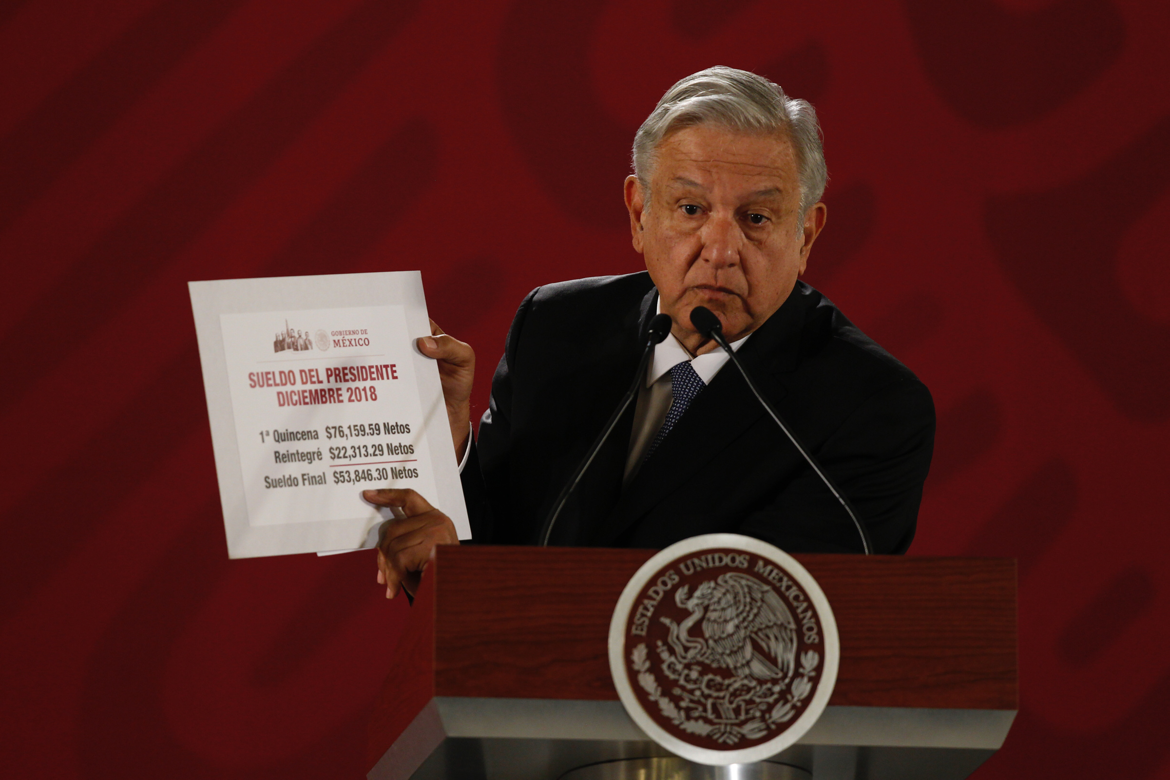 81218002. México, 18 Dic 2018 (Notimex- Oscar Ramírez).- En su conferencia de prensa matutina, el presidente Andrés Manuel López Obrador informó que ya recibió su primera quincena como mandatario por 76 mil 159.59 pesos, sin embargo, de acuerdo con la nueva Ley Federal de Remuneraciones de los Servidores Públicos, devolvió a la Tesorería de la Federación 22 mil 313.29 pesos, y llamó a los funcionarios del Poder Ejecutivo a hacer lo mismo.
