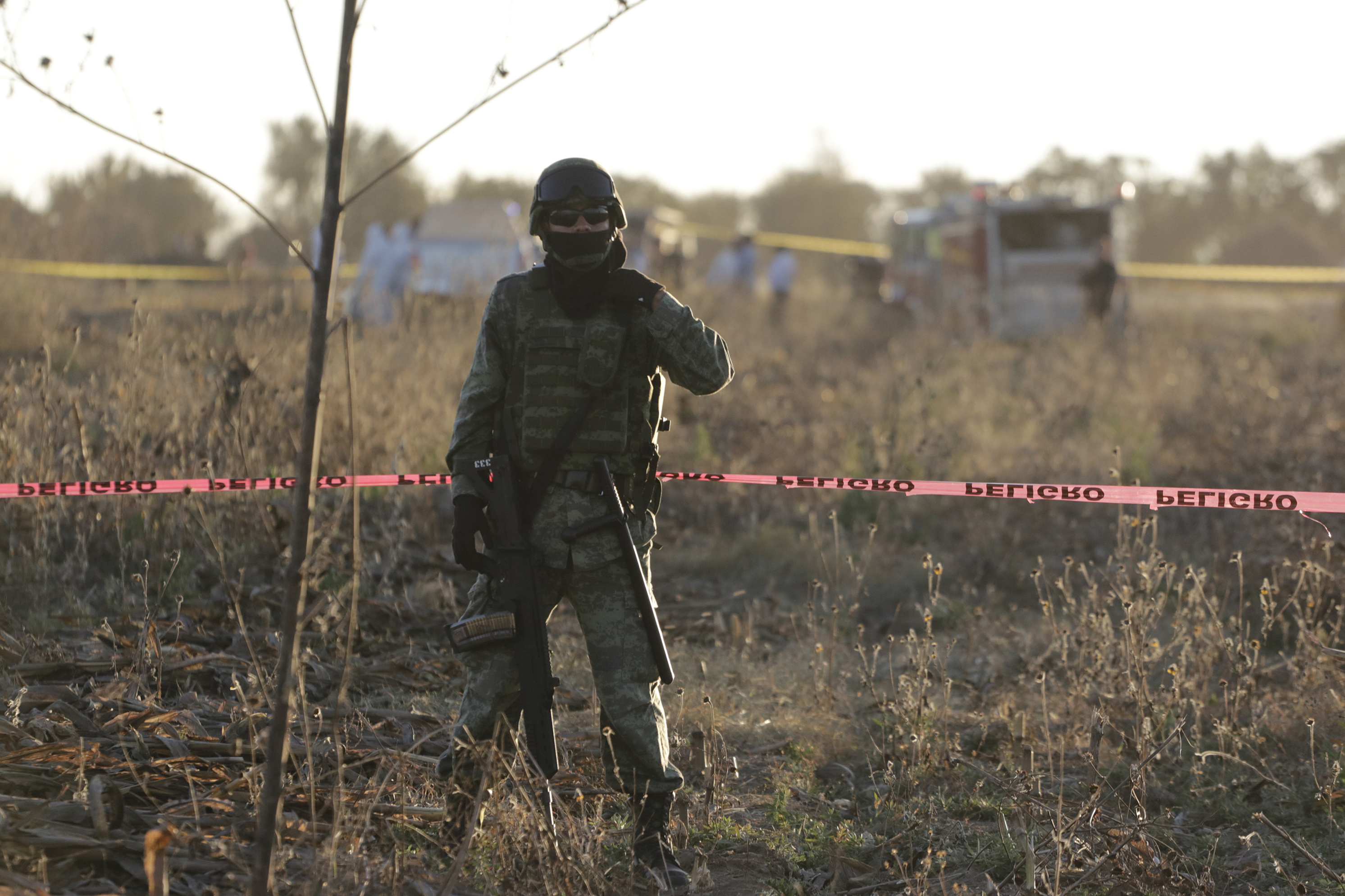Elementos de corporaciones de los tres órdenes de gobierno cercan el área donde se impactó el aeronave donde viajaba la gobernadora Martha Erika Alonso Hidalgo. Foto: Notimex