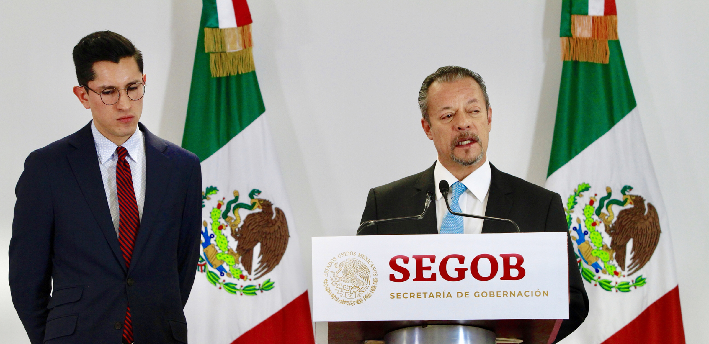 90125125. México, 25 Ene 2019 (Notimex-Javier Lira).- El vocero de la Secretaría de Relaciones Exteriores, Roberto Velazco y Héctor Gandini, vocero de la Secretaría de Gobernación, dieron lectura a un documento elaborado por las dos dependencias, donde reiteran el compromiso con los migrantes y los derechos humanos y que el país recibirá a migrantes por razones humanitarias. NOTIMEX/FOTO/JAVIER LIRA/JLO/POL/MIGRA16