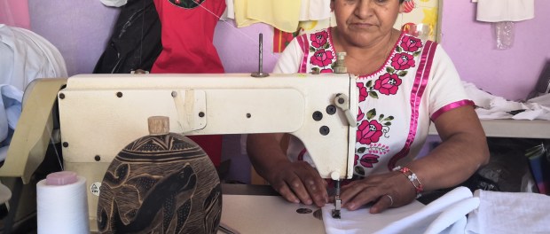 Doña Felipa, una mujer indígena de unos 50 años de edad utiliza su máquina de coser para crear estos creativos diseños.