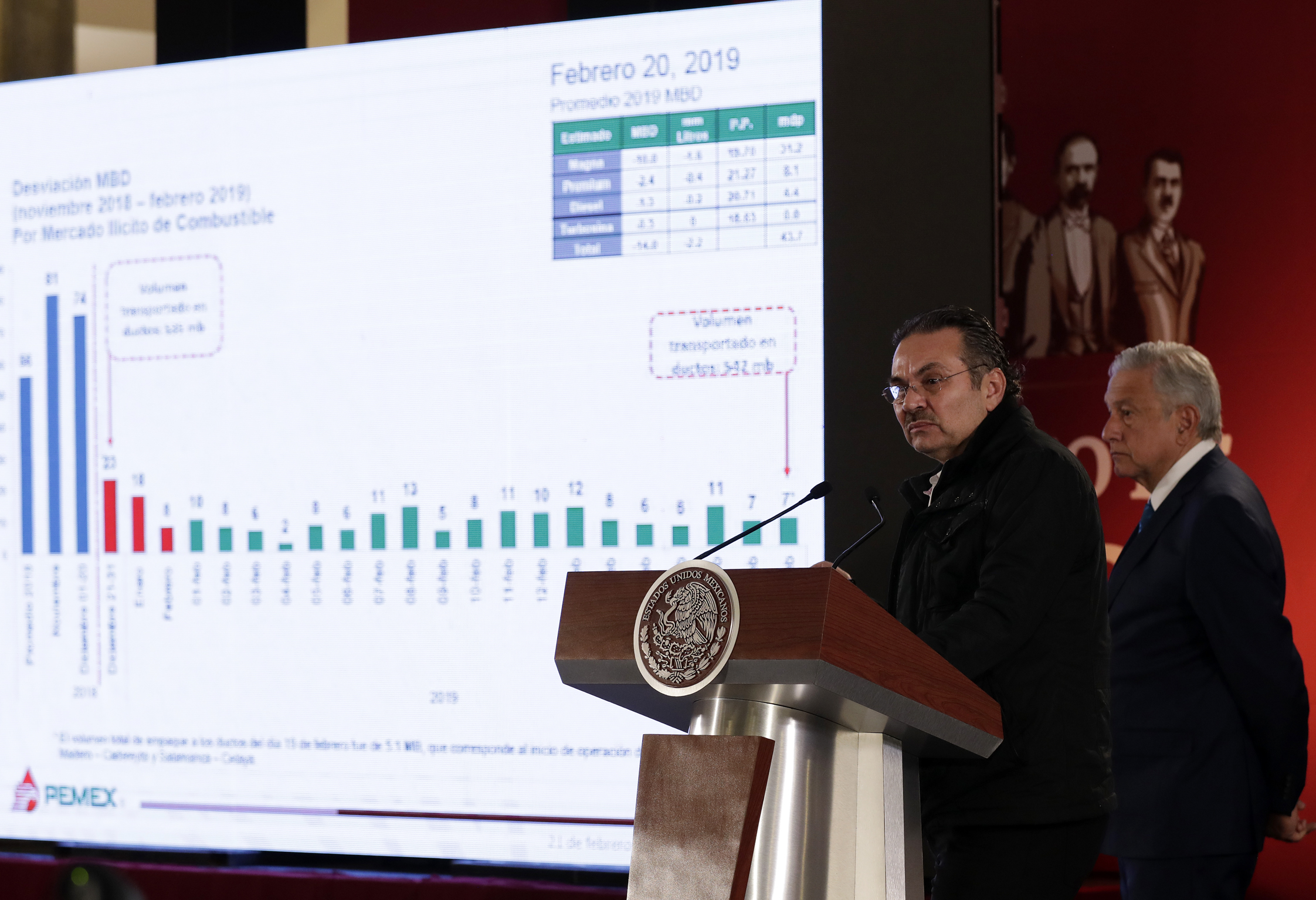 90221023. México, 21 Feb 2019 (Notimex- Arturo Monroy).- El director general de Pemex, Octavio Romero, afirmó que el abasto de combustible prácticamente se ha normalizado en todo el país, en conferencia de prensa matutina en Palacio Nacional, acompañado del presidente Andrés Manuel López Obrador.
