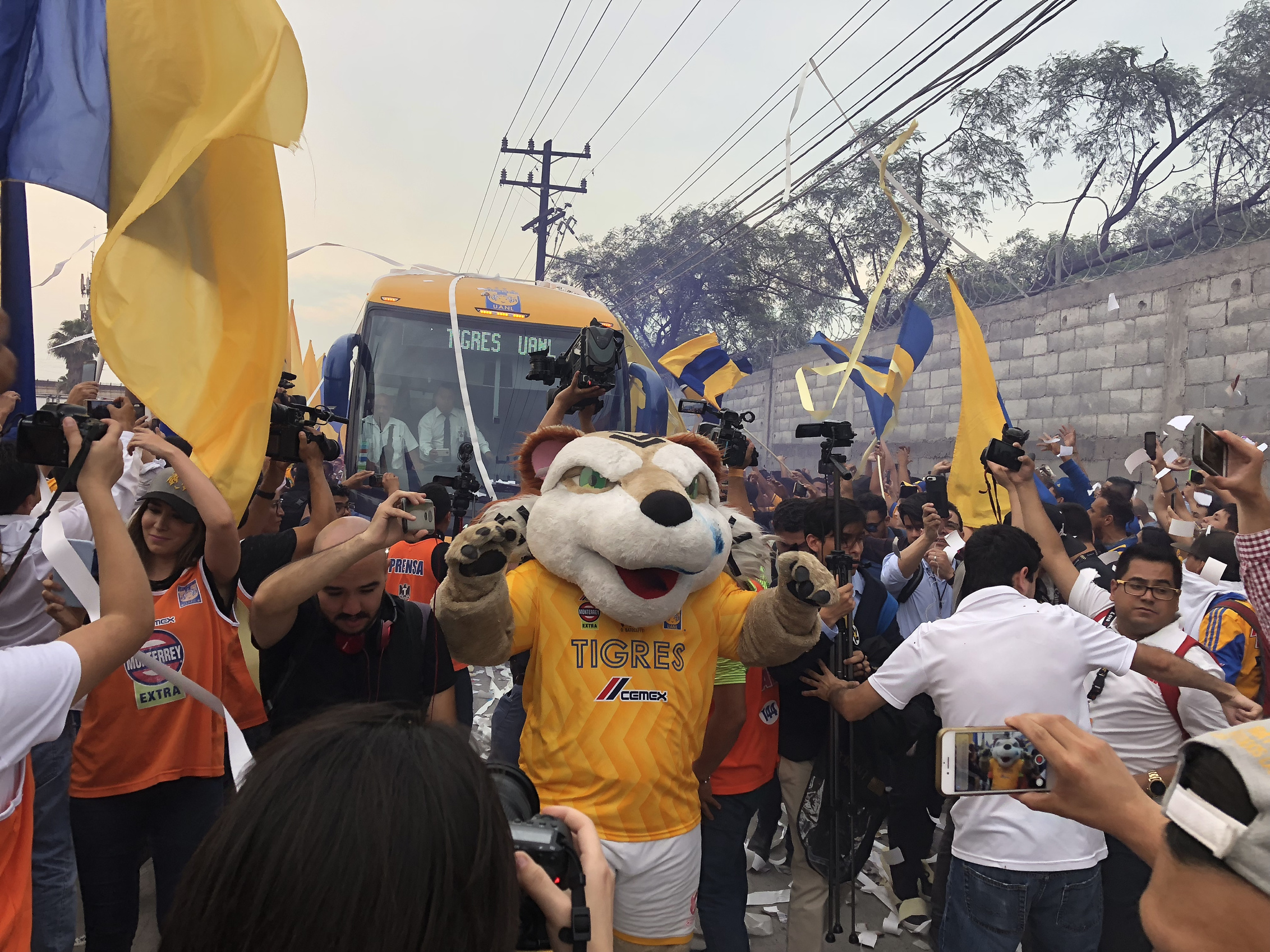 Apoyo incondicional mostraron los seguidores de los Tigres de la UANL, al recibir a su equipo entre cánticos y porras en el estadio Universitario previo a la final ante León. Foto: Notimex