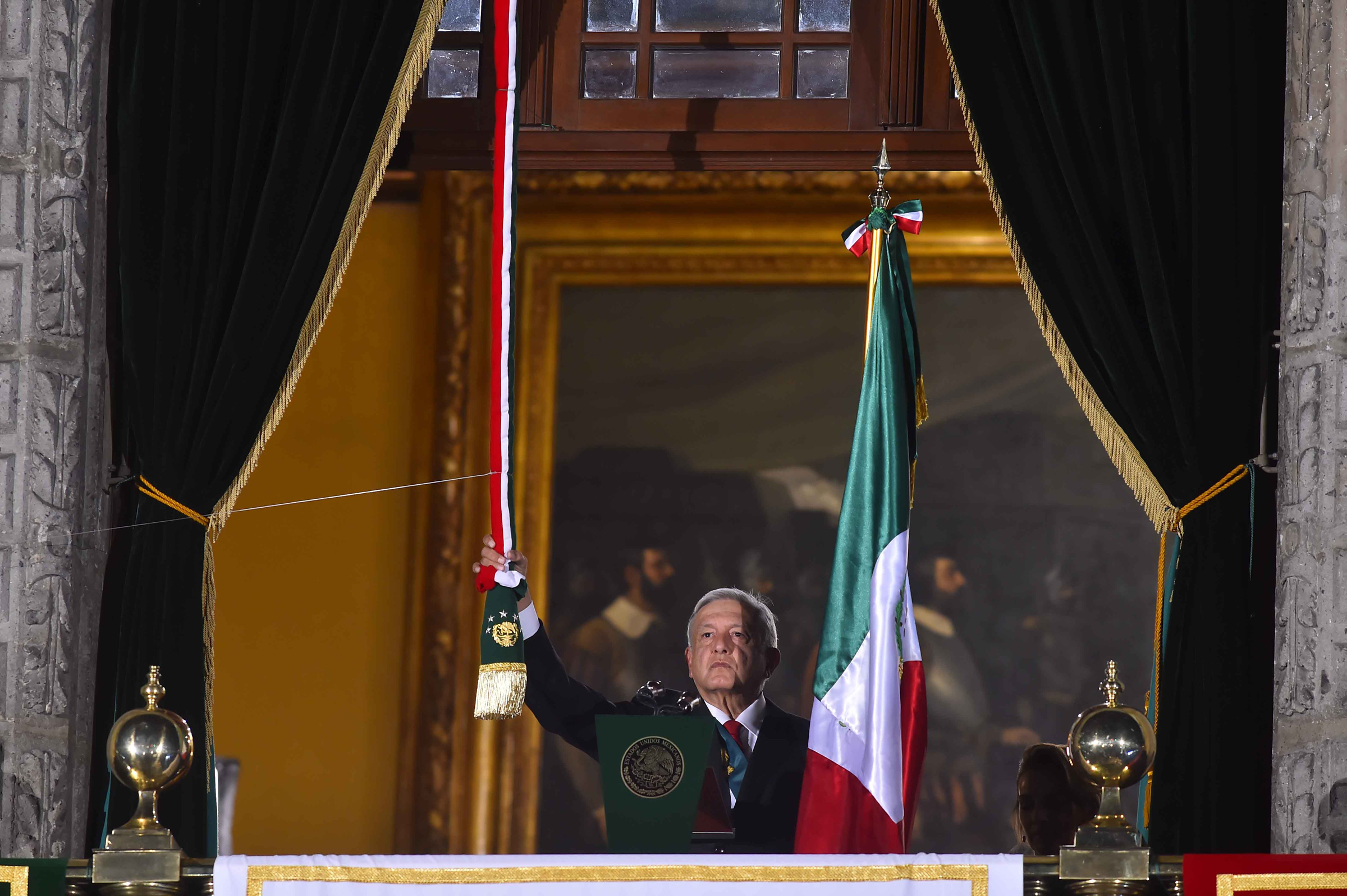 El mandatario, con la banda presidencial al pecho y el rostro solemne, recibió de manos de la guardia de honor la bandera tricolor, con la cual salió al balcón un minuto antes de las 11:00 y se dirigió ante las más de 80 mil personas reunidas en el Zócalo e hizo tañer la campana de Dolores y hondeó el lábaro patrio.