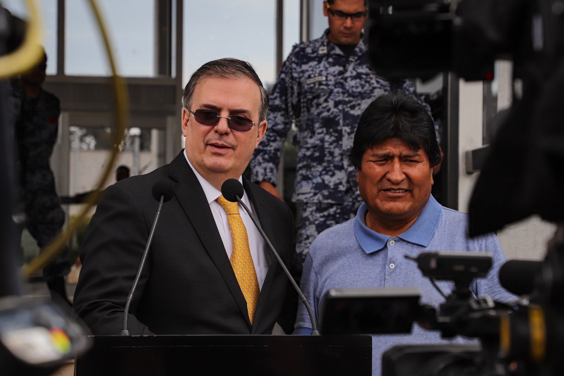 Evo Morales, ex presidente de Bolivia, llega a la Ciudad de México. Marcelo Ebrard, secretario de Relaciones Exteriores, le da la bienvenida. Foto: Notimex