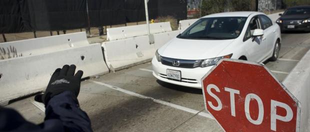 Un agente de la Oficina de Aduanas y Protección Fronteriza de EUA ordena a un auto que se dirige hacia México que pare para realizar una inspección. Foto: EFE