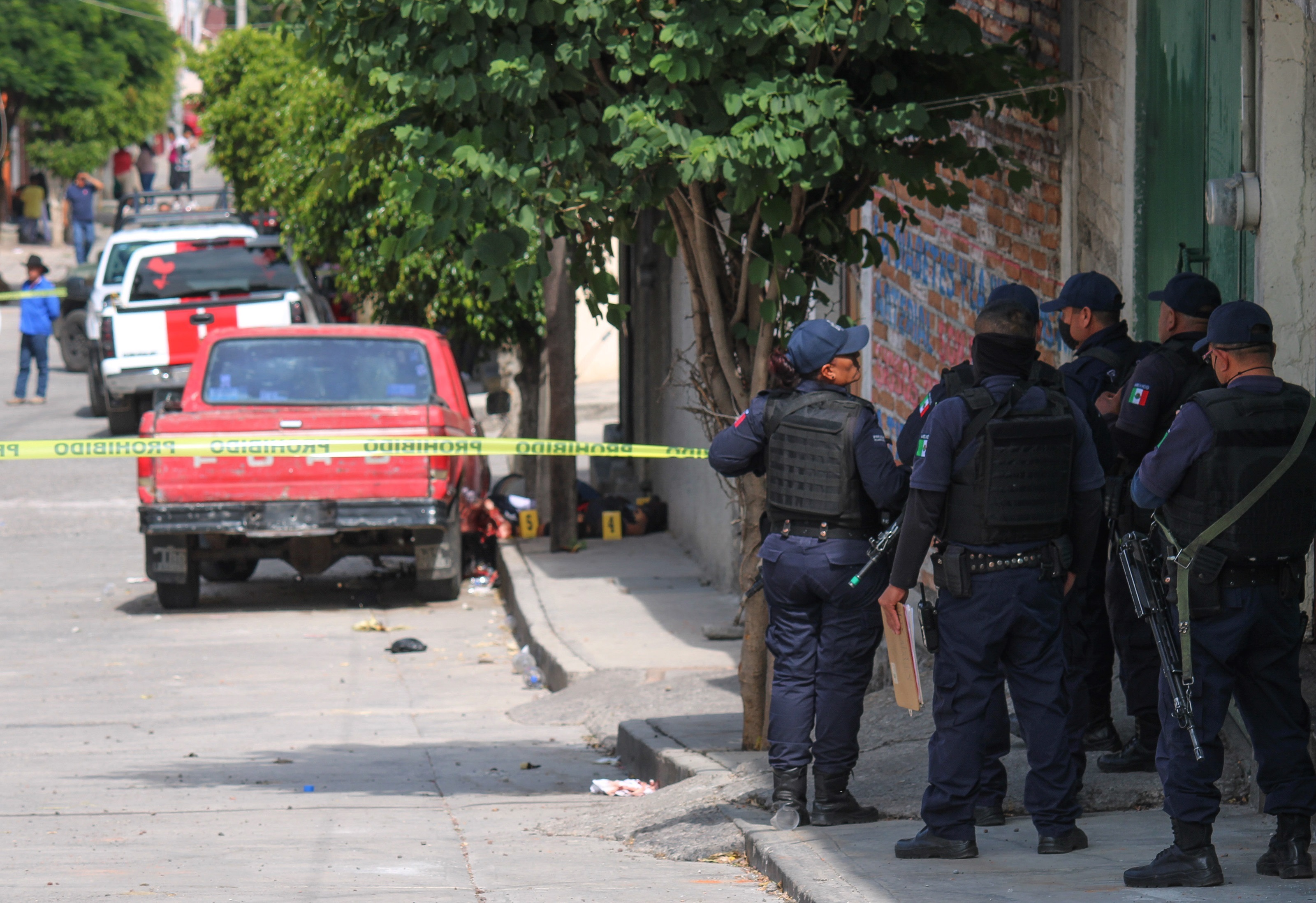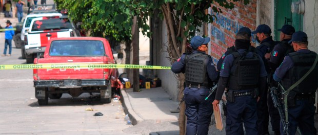 Policías vigilan el sitio donde ocurrió una masacre en el poblado de Jaral del Progreso, en Guanajuato. Foto: EFE