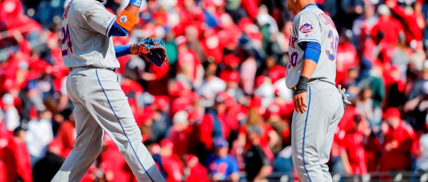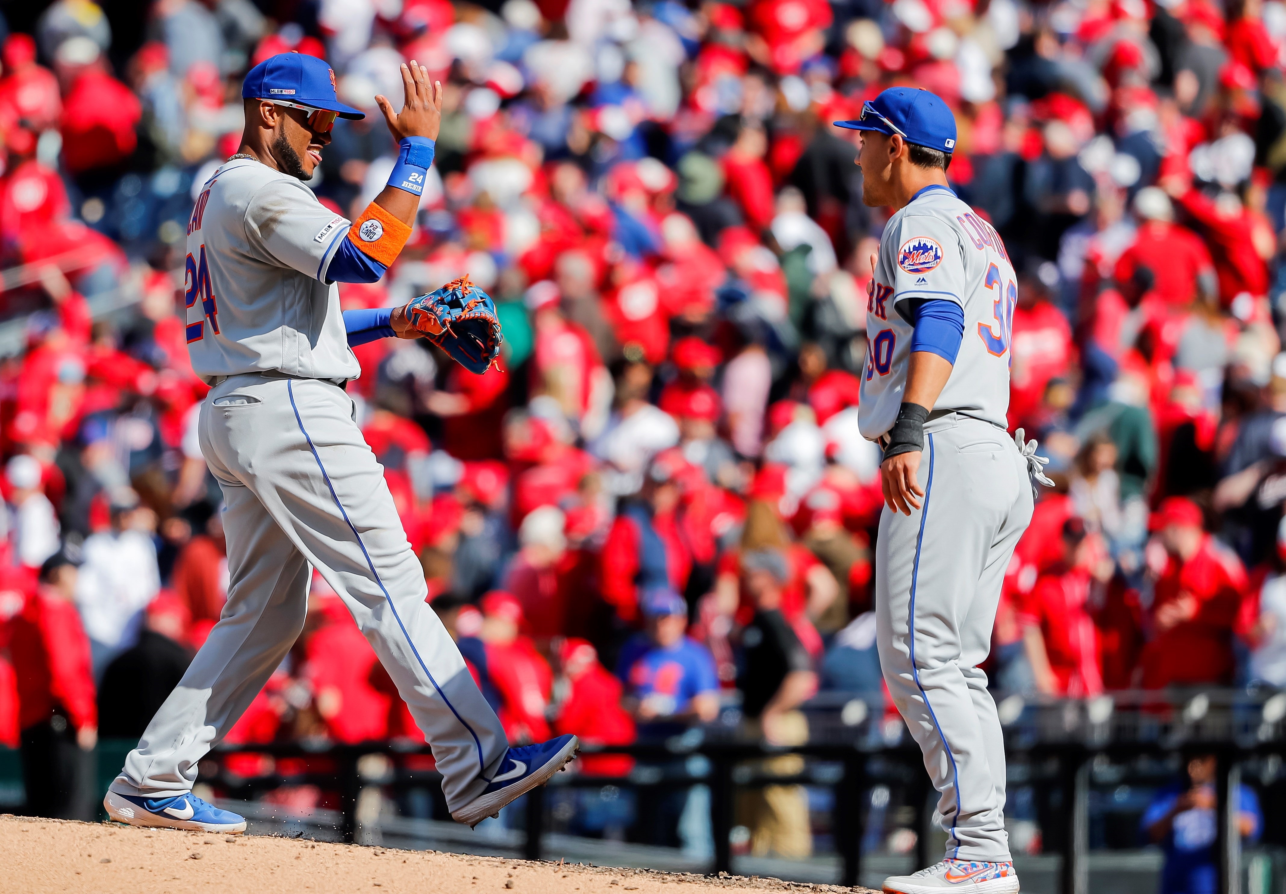 El segunda base de Mets Robinson Canó (i) conversa el jardinero izquierdo Michael Conforto (d) durante un partido entre Mets y Nacionales. Foto: EFE