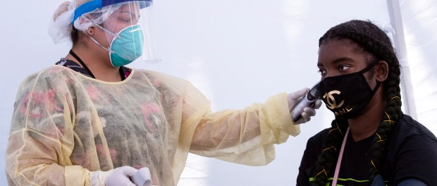 Una enfermera revisa la temperatura y los signos vitales de Una menor antes de hacerse la prueba de Covid-19 en la escuela primaria McKinley, en Compton, al sur de Los Ángeles, California. Foto: EFE