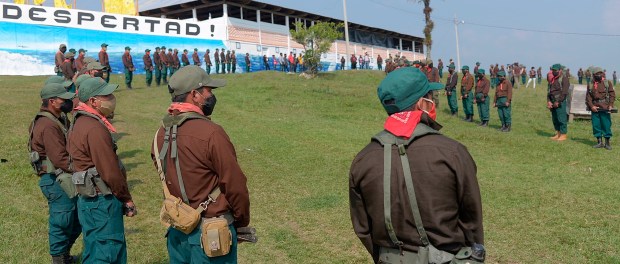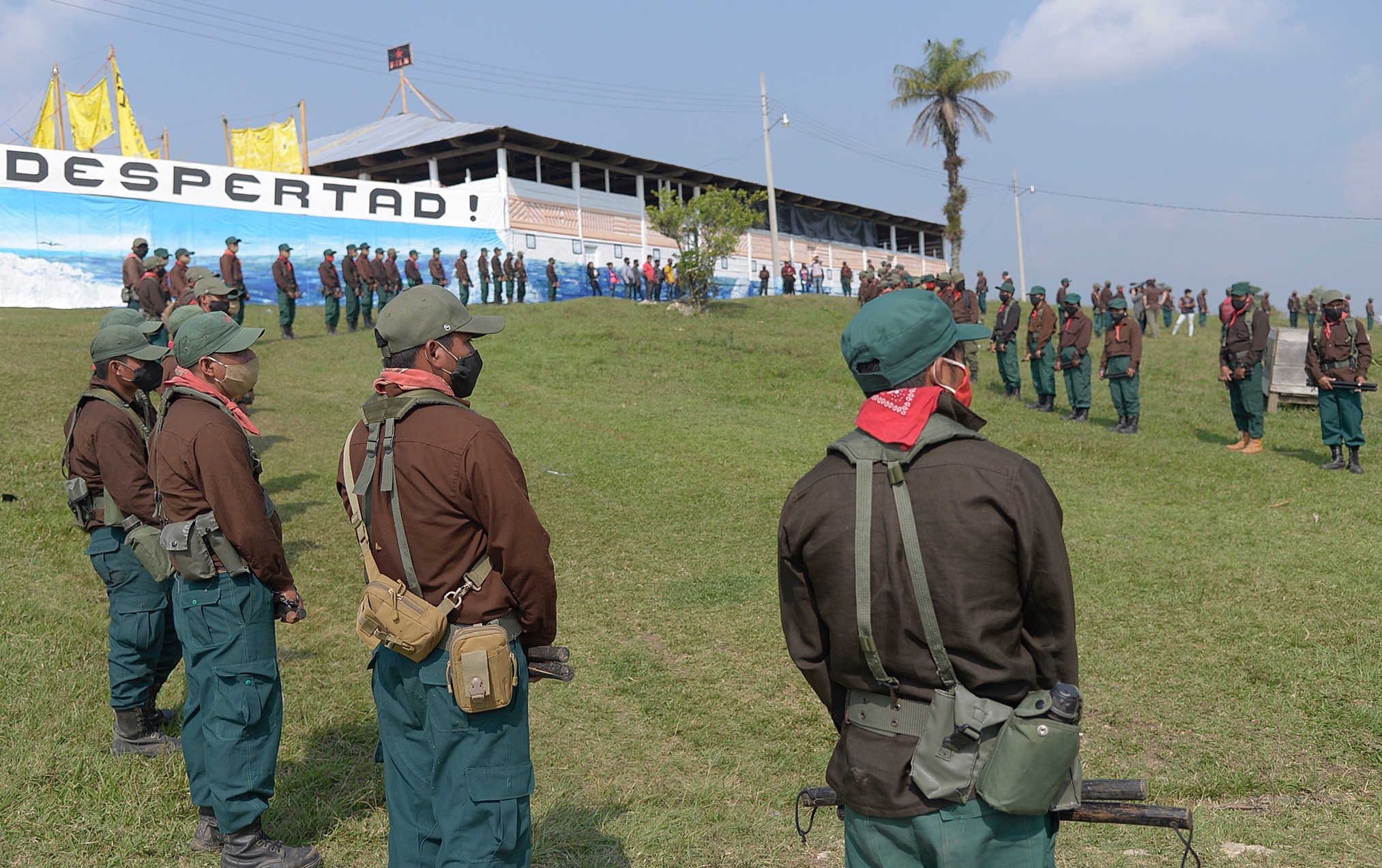 Integrantes del Ejército Zapatista de Liberación Nacional (EZLN), despiden a una delegación de sus compañeros, en Altamirano, Chiapas. Foto: EFE