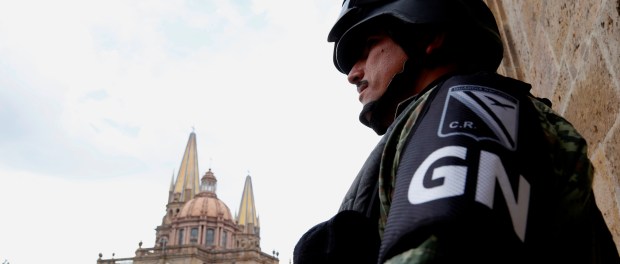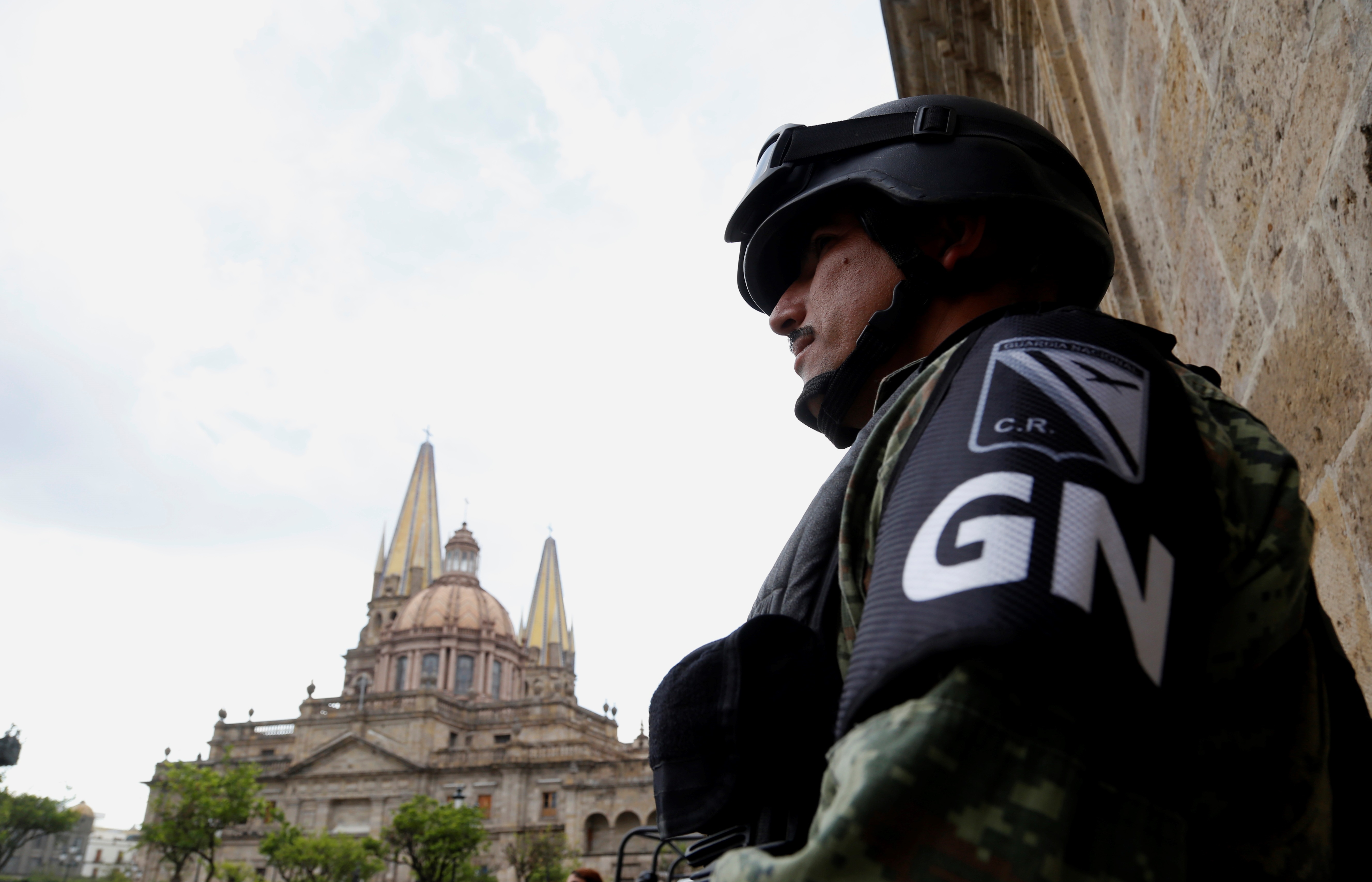 Un miembro de la Guardia Nacional vigila una de las principales calles del centro histórico de la ciudad de Guadalajara. Foto: EFE/Archivo