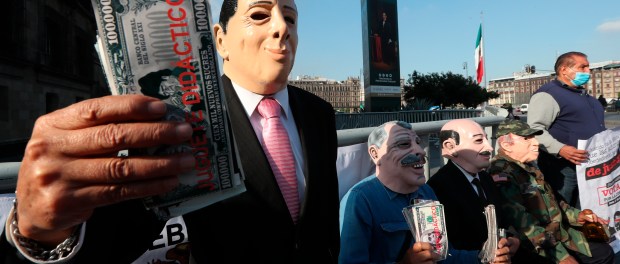Un grupo de ciudadanos protestan con mascaras de los expresidentes de México al exterior de Palacio Nacional, en la Ciudad de México. Foto: EFE