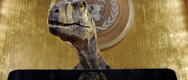 Un dinosaurio ocupa la ONU para exigir a los humanos que no se extingan