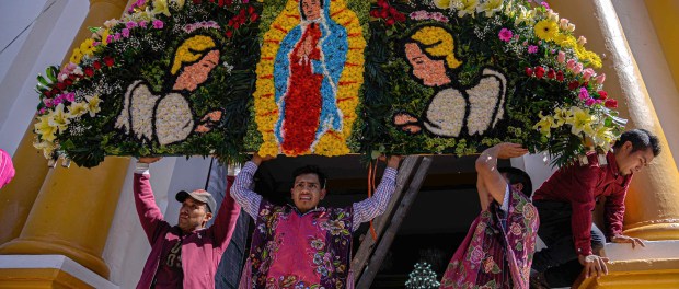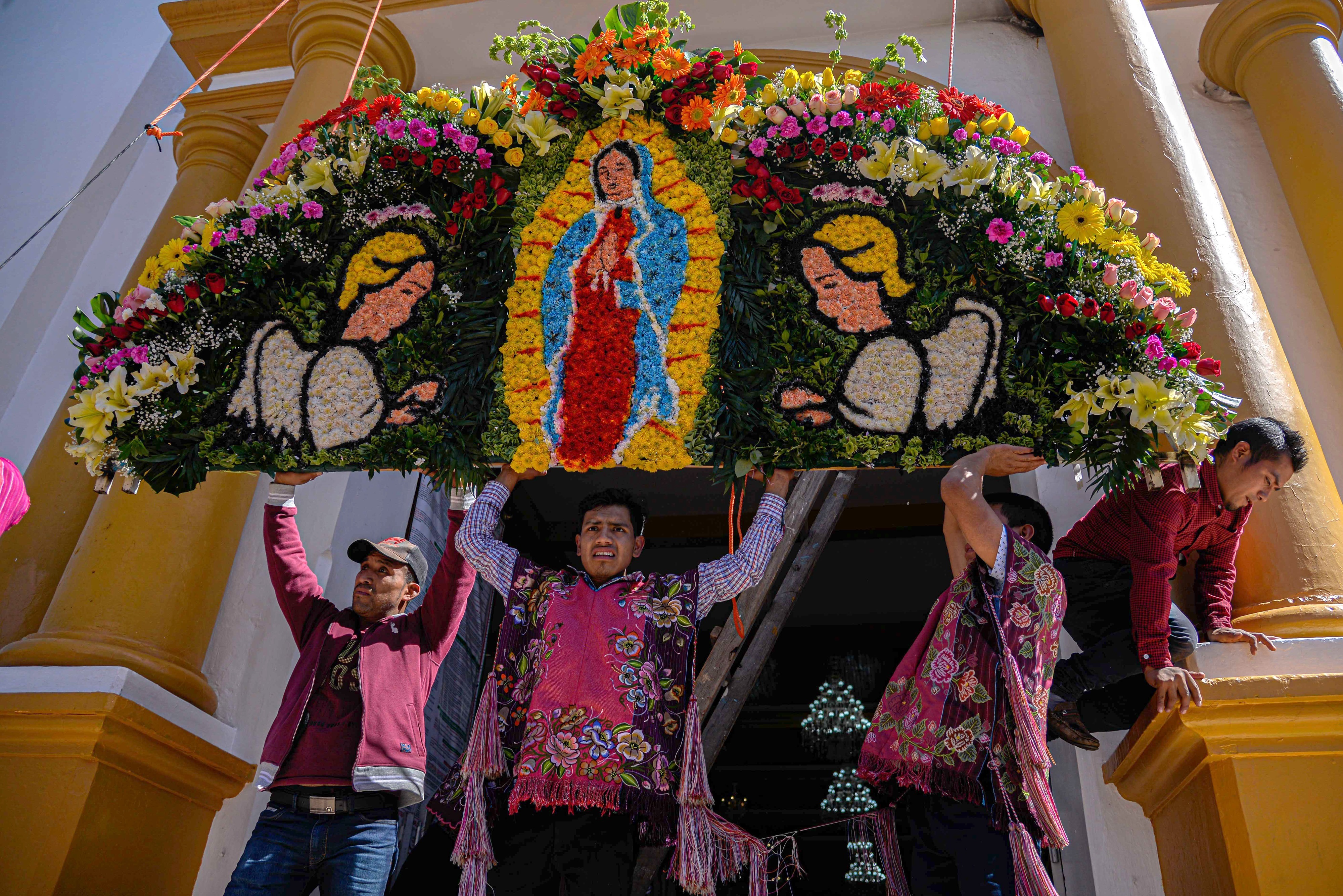 Indígenas cargan una decoración floral a la Virgen de Guadalupe en el municipio de San Cristóbal de las Casas, en Chiapas. Foto: EFE