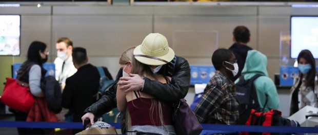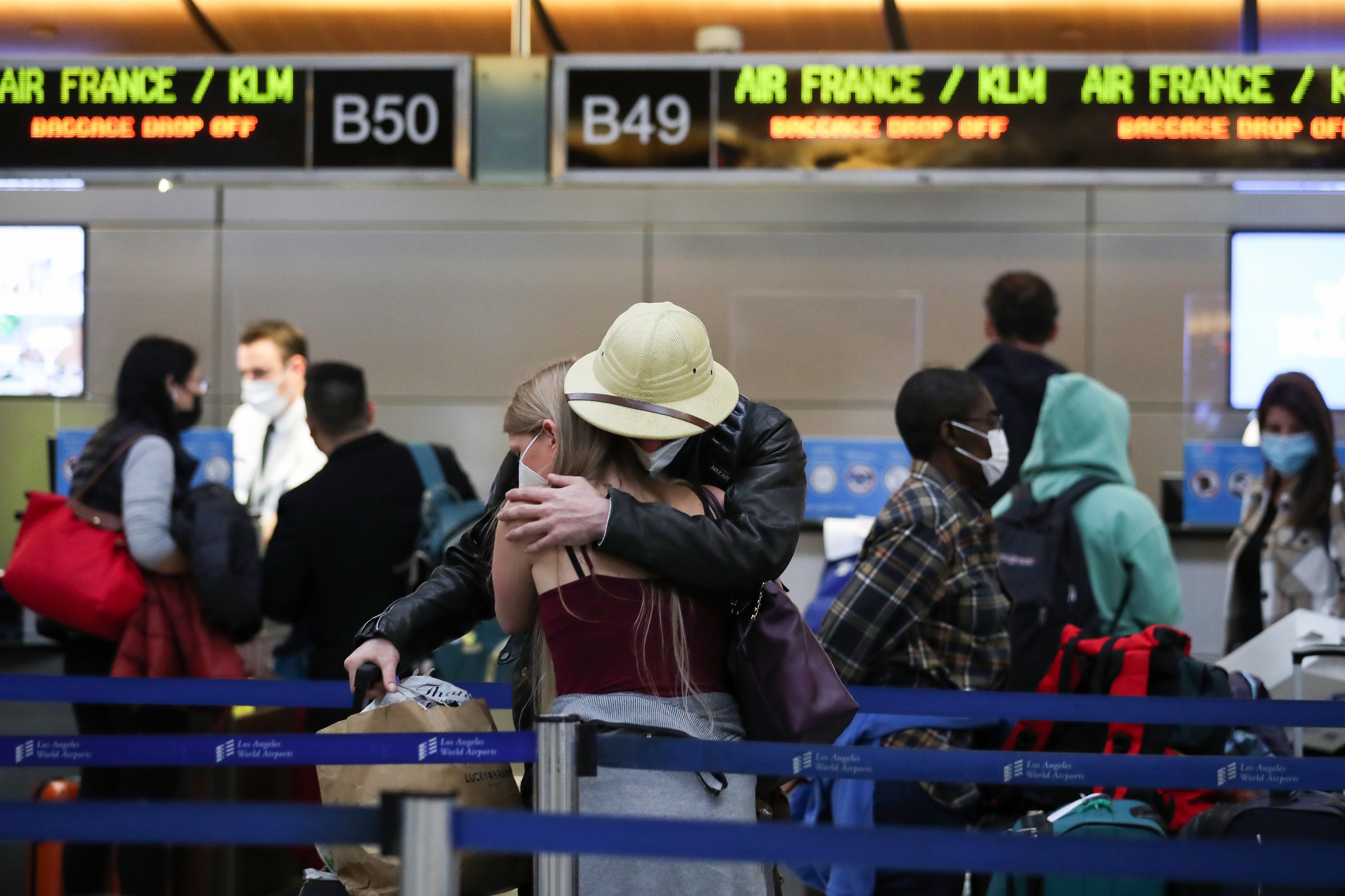 Las personas se abrazan mientras esperan en la fila de facturación de Air France / KLM en la Terminal Internacional Tom Bradley del Aeropuerto Internacional de Los Ángeles, California. Foto: EFE